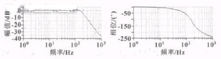 依据国外某一标准三级电液伺服阀来设置模型的各项参数。取先导阀幅频宽f-3dB = 140Hz, 供油压力为21MPa。主控制阀芯直径D = 22mm, 供油压力为7MPa。设置好所有相关参数后进行仿真, 在仿真过程中动态修改PID控制器的各项参数来优化阀的各项性能参数。这里主要关注阀的流量增益、压力增益、流量- 压力系数和频宽等性能参数。仿真优化结束后绘制不同曲线来得到阀的各项性能参数, 如空载流量曲线和闭环波德图, 图6为空载流量曲线, 通过此曲线可得到阀的死区大小、流量增益和额定流量等; 图7 为闭环波德图,通过此图可得到阀的幅频宽和相频宽。