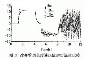 图4,图5为管长分别为5m, 10m和15m的液压缸输出位移与预定的输出位移比较图和液压缸进口流量图。由图4可知,液压系统随着管道的增大其响应时间增加,液压缸输出位移并不能精确稳定于预定的输出,而是在一定的范围内震荡,并不能精确定位。由图5可知,考虑管道效应的液压定位系统,流量脉动随着液压管道长度的增加而加剧,很可能使液压缸产生爬行现象,影响液压系统的定位精度。