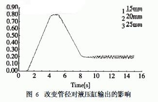 图6为管径分别为15mm, 20mm和25mm的液压缸输出位移仿真图。该图显示,液压缸输出位移随着管道直径的增加其响应时间增加,且定位误差增大。