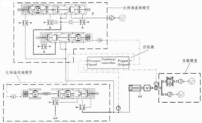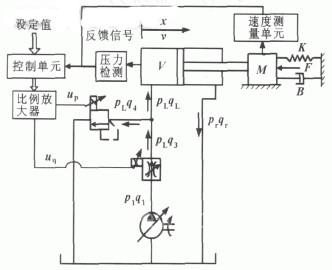 图中采用电比例控制变量泵供油实现负载传感节能控制, 比例调速阀调节进入系统的流量q3 , 比例溢流阀控制液压缸推进压力pL。系统工作过程中流量满足如下关系:
