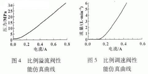 由于盾构推进系统采用电液比例控制技术完成控制任务,系统中的流量和压力控制阀均为比例阀。图2 和图3 分别为该系统中的比例溢流阀和比例调速阀结构原理图。通常阀的物理结构参数是未知的,所以建立系统模型之前, 先必须建立阀元件的模型。阀的物理结构在AMESim环境下采用HCD库组件构造而成。为了使仿真模型能够更加真实地逼近实际阀的工作性能从而完成整个系统的仿真任务, 借助软件中的批处理功能进行阀结构参数优化, 最终得到了与阀的实际工作特性相一致的输入电流和输出压力、流量性能曲线, 如图4和图5所示。可见, 在输入信号较低的阶段, 比例阀模型存在一定的死区范围, 这与实际采用比例电磁铁作为电- 机械转换器的控制元件的本身特性相符合。