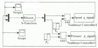 图6中的双输入双输出控制器模型是推进系统控制的主要执行单元, 该模型包含的具体内容在Matlab /Simulink仿真环境中完成, 其结构如图7 所示。图中名称为Bihuan_的控制模块为Simulink软件可以调用的S 函数, 其输入和输出分别对应于AMESim中控制器的输出和输入, 即将压力和速度传感器的检测信号作为输出量, 而压力和流量阀控制电信号作为输入量。传感器反馈信号与设定压力、速度信号比较之后经过非线性PID控制器校正, 输出信号用于控制比例阀, 从而实现闭环控制。