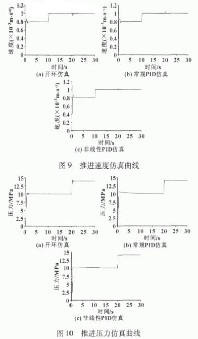 图9和图10分别展示了盾构推进液压系统压力和速度变化仿真曲线, 对于每个参数分别将开环输出结果、闭环普通PID控制和非线性PID控制结果进行对比。从图9 ( a)和图10 ( a)可以看出, 压力和速度在初始时刻阶跃上升到一定值的时候都会产生一定的超调和振荡, 而且在稳定工作过程中, 调节其中一个参数会导致另外一个参数受到干扰。仿真中, 推进速度在10 s时由018mm / s增加到1mm / s, 压力在20 s时从10MPa调整到14MPa。从仿真结果对比可以看出,采用非线性PID控制校正之后, 与普通PID控制相比,在仿真起始段和调压时产生的速度波动能够得到更好地抑制, 但由于系统总的惯量较大, 校正之后仍然存在着较小的超调量。在压力控制方面, 非线性PID控制能够将PID控制时起始段的压力超调量从将近1MPa降低到015MPa左右, 且压力响应曲线上升时间约为1s, 而调速导致的压力波动基本被消除了。由此可见,非线性PID控制比PID具有一定的优越性。