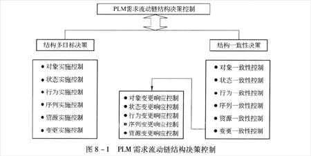 PLM需求流动链结构决策控制技术动态地记录需求流动链结构实施状态。PLN需求流动链结构决策控制包括两方面内容:PLM需求流动链结构多目标决策和PLM需求流动链结构一致性决策,图8一1为PLM需求流动链结构决策控制。