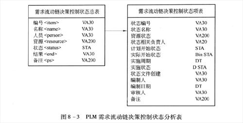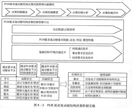 图8一2为PLM需求流动链结构决策控制实施。图8一3为PLM需求流动链决策控制状态分析。PLM需求流动链结构决策控制是在PLM需求流动链基础结构/环境实施技术,如网络通信技术、集成需求信息技术以及协同需求信息技术的支持下,对需求流动链实施过程中的动态数据、信息、特征以及模型转换等过程进行决策控制描述、决策控制模型、决策控制分析和决策控制评价。在实施过程中,有效地控制PLM需求流动链各阶段节点的结构状态,如激活/非激活、受限使用、暂停使用以及失效/冻结等情形。通过决策分析技术对PLM需求流动链需求结构初始化到需求结构实现的全过程进行有效的控制,保证PLM需求流动链需求结构的准确性、一致性、可控性和可追溯性。