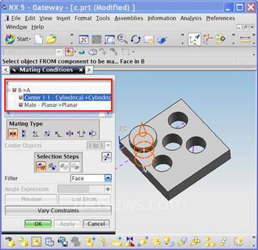 在装配设计过程中有时需要连续装配多个部件,如螺钉、销等。它们的约束方式类似只是装配位置不同,用户可以用NX中的约束记忆的方法,避免重复定义约束。如下图的例子中需要将螺钉(B)多次装配到板(A)的孔位上,下面的步骤说明如何使用约束记忆的方法实现。