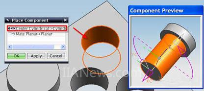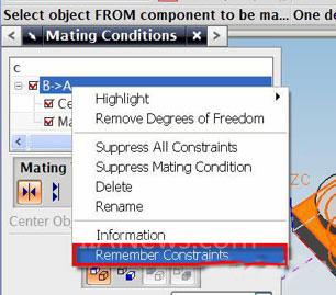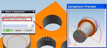 (3)继续装配该螺钉到别的孔位置,由于使用了约束记忆,NX将会出现如下图所示的对话框。用户只需指定记忆保存的约束关系在新的装配位置里的关联对象。本例中分别为CenterCylindrial->Cylindrial和MatePlanar->Planar指定新的约束对象。