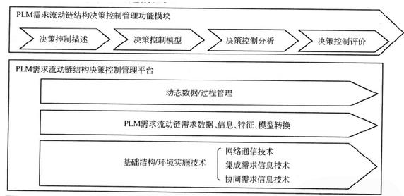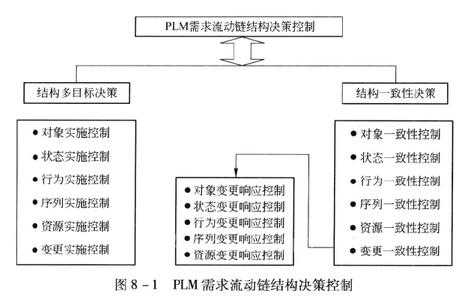 PLM需求流动链结构决策控制技术动态地记录需求流动链结构实施状态。PLN需求流动链结构决策控制包括两方面内容:PLM需求流动链结构多目标决策和PLM需求流动链结构一致性决策,图8一1为PLM需求流动链结构决策控制。