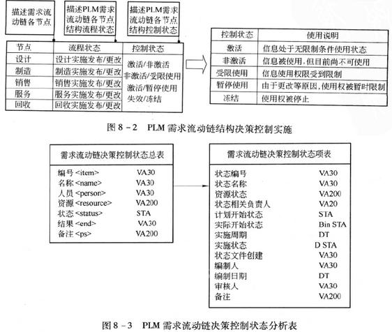 图8一2为PLM需求流动链结构决策控制实施。图8一3为PLM需求流动链决策控制状态分析。PLM需求流动链结构决策控制是在PLM需求流动链基础结构/环境实施技术,如网络通信技术、集成需求信息技术以及协同需求信息技术的支持下,对需求流动链实施过程中的动态数据、信息、特征以及模型转换等过程进行决策控制描述、决策控制模型、决策控制分析和决策控制评价。在实施过程中,有效地控制PLM需求流动链各阶段节点的结构状态,如激活/非激活、受限使用、暂停使用以及失效/冻结等情形。通过决策分析技术对PLM需求流动链需求结构初始化到需求结构实现的全过程进行有效的控制,保证PLM需求流动链需求结构的准确性、一致性、可控性和可追溯性。