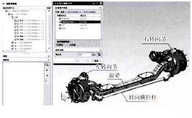 在与Teamcenter集成的NX环境中,将前桥模型装配到整车模型后,在整车环境中打开周边系统如悬架系统、车架系统,通过更换前桥布置模型来进行快速校核,如图4所示。