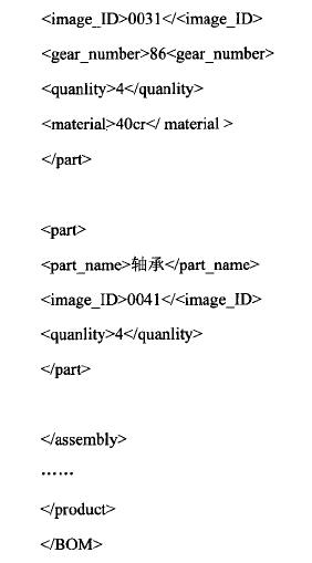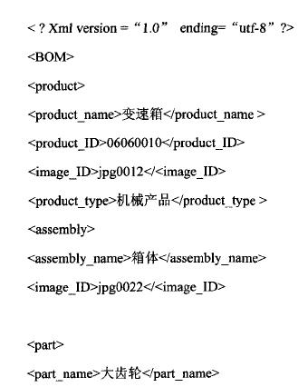(4)文档高度结构化XML通过自定义标识,将文档分解为有一定含义的标记表达的元素,并可给每个元素附带额外的信息(属性),由此成为层次分明的数据结构。由于XML具有如此多的优点,选择XML作为中间格式实现PLM应用系统集成之间的数据交换。每个独立的系统各自把自己的数据转换成XML这种中间格式,通过集成框架实现数据交换与信息的共享,实现了集成框架的平台无关性和强大的可移植性。我们以CAPP与PLM 系统之间的数据交换为例来说明:CAPP与PLM 系统是以BOM 的形式进行数据交换的。CAPP从PLM 系统中得到EBOM及其属性,CAPP系统和PDM 统之间主要的交换数据是BOM (Bill OfMaterial,物料清单)表,CAPP从PDM 中得到设计BOM 和设计属性,PDM从CAPP中得到工艺BOM和装配BOM,产品结构树是BOM表的中心内容。下面给出一个用XML实现的产品结构树例子: