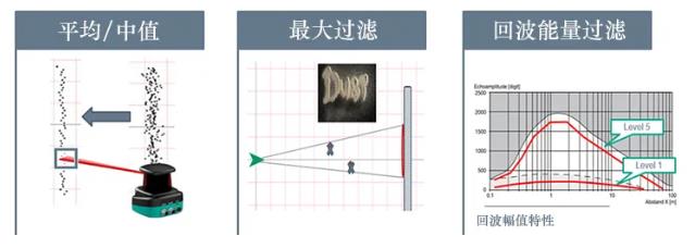 用户可以选择四种不同的过滤方式进行预处理,包括平均/中值过滤、最大过滤和回波能量过滤。平均/中值过滤用于噪音程度最低的场景,以实现更高的测量精度。最大过滤能够降低灰尘和近场微小物体(比如雨滴)对测量的干扰,确保在户外和恶劣环境中的可靠运行。回波能量过滤可以区分测量反射板和自然目标,从而抑制低反射目标。