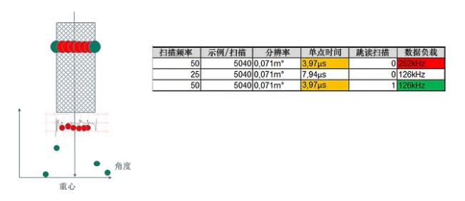 与全局参数扫描频率定义的扫描记录频率相比,跳读扫描功能能够通过扫描数据的连接来降低扫描的输出频率,每进行一次的扫描数据传输,下一次的数据输出会被抑制。这一功能对部分需要高频率扫描的应用非常有用,可以降低动态环境中(例如 AGV)记录扫描数据的运动模糊效应。